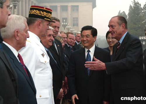 中國國家主席胡錦濤十月九日在北京舉行儀式,歡迎法國總統希拉克訪華。中新社記者:滿會喬
