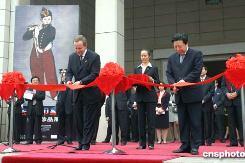 中新社北京十月十日電(記者李靜)“法國印象派珍品展”今天在中國美術館開幕,中國國家主席胡錦濤和在華訪問的法國總統希拉克,以及兩國元首的夫人一道觀看了畫展,法國奧賽博物館館長樂莫瓦納兼任全程解說。