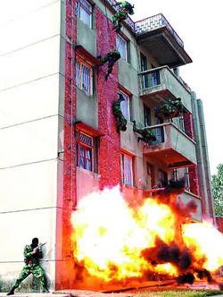 驚心動魄的反劫持人質“戰斗”打響了!5名“恐怖分子”作案后,駕駛一輛面包車劫持3名“人質”逃竄。特勤中隊接到上級命令后,立即兵分兩路,一路在各主要路口設障攔截,一路沿“歹徒”逃離方向實施追擊。在走投無路的情況下,“歹徒”劫持“人質”竄到某單位一辦公樓。在雙方對峙不下時,根據上級指示,特勤中隊采取強行突擊。說時遲,那時快,一聲巨響后,戰士們空中突降,從窗口魚躍而入,隨著幾聲槍響,“歹徒”們死的死,傷的傷,全被制服,3名“人質”安然無恙,演練場內再次掌聲如潮……