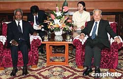 中國國務院前副總理錢其琛,十月十一日在北京釣魚臺國賓館會見來訪的聯合國秘書長安南。作者:毛建軍