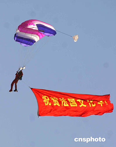 十月十一日,為祝賀法國文化年在中國舉行,中國人民解放軍空軍在法國空軍“法蘭西巡邏兵”飛行表演后,進行了跳傘表演。圖為跳傘隊員在空中打開醒目的標語。中新社記者:張勤