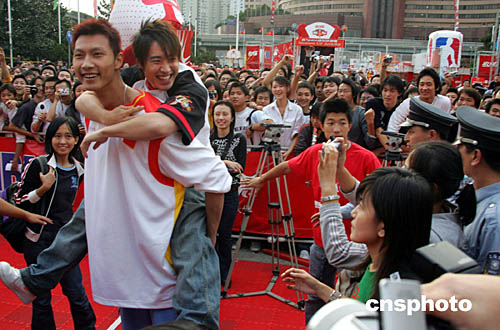 NBA中國(guó)大賽十月十四日即將在上海體育館舉行。十三日舉行的“可口可樂(lè)NBA嘉年華”出現(xiàn)火爆追星情形。可口可樂(lè)形象代言人潘瑋柏一見(jiàn)中國(guó)男籃隊(duì)球員易健聯(lián)便跳躍在其背上,引起上海追星族歡呼和現(xiàn)場(chǎng)混亂。作者:潘索菲