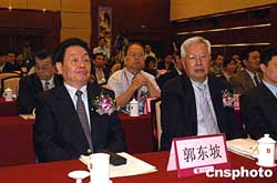 中國(江門)僑鄉華人嘉年華暨2004中國(江門)僑鄉旅游節活動之一的“華人論壇”,十月十八日在廣東江門市舉行,全國政協副主席羅豪才(右)、全國政協港澳臺僑委員會主任郭東坡(左)出席論壇。作者:羅仰明