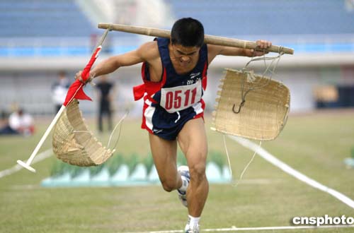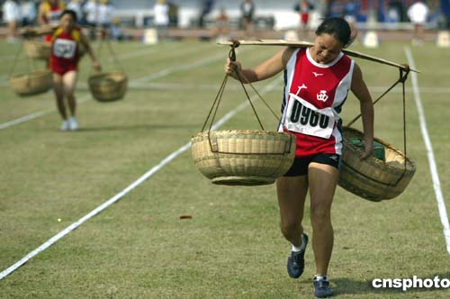 具有濃郁農(nóng)村特色的挑搬糧食比賽成為賽場(chǎng)上亮點(diǎn),參賽選手在比賽中不僅要有速度,還要有力量和平衡感。圖為女子八十米挑搬糧食比賽。中新社記者:盛佳鵬