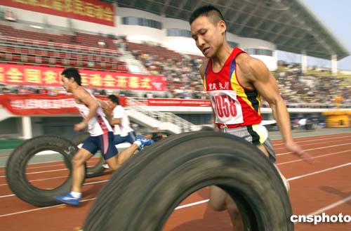 特色十足的一百米推輪胎比賽將速度與技巧結(jié)合在一起,成為賽場(chǎng)上的一個(gè)亮點(diǎn)。圖為參賽選手在男子一百米推輪胎比賽中奮勇爭(zhēng)先。中新社記者:盛佳鵬