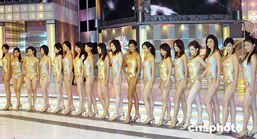 2004亞洲小姐競選總決賽十月二十四日晚在香港演藝學院舉行,來自各國的十八位參賽佳麗爭奪是次大賽桂冠。圖為參賽佳麗身穿泳裝展示風采。中新社記者:錢興強