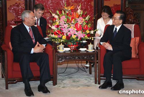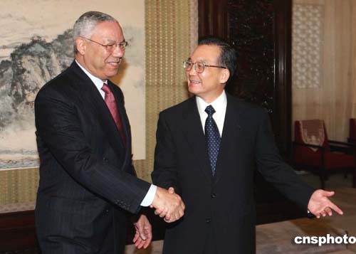 鮑威爾表示,很高興再次訪問北京。他對溫家寶訪問美國記憶猶新。在那次訪問期間,布什總統重新確認了一個中國的政策。