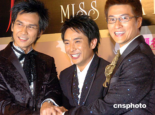 2004亞洲小姐競選總決賽,于十月二十四日晚在香港演藝學院舉行,香港藝員陳啟泰(左)、梁思浩(中)、林韋辰(右)擔任競選決賽司儀。中新社記者:錢興強