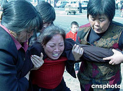 據(jù)國家安監(jiān)局網(wǎng)站消息,河南省鄭州煤電(集團(tuán))有限責(zé)任公司大平煤礦二十日二十二時十分發(fā)生的瓦斯突出事故截止25日20:30已找到122名遇難者,仍有26人被困于井下。救援工作仍在進(jìn)行之中。圖為在礦難現(xiàn)場外悲痛欲絕的大平礦難家屬。作者:王迪