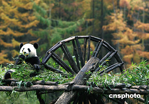 深秋時節,四川臥龍大熊貓保護基地層林盡染,基地幼兒園的大熊貓寶寶無憂無慮地嬉戲于這片人類精心建造的、與大自然接壤的“大熊貓樂園”中。中新社記者:任晨鳴