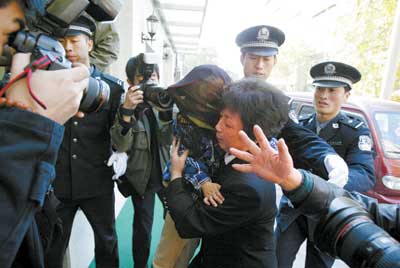 一看到記者們的鏡頭,中年婦女立即一手拼命遮擋鏡頭,另一手捂著元元的臉,甚至用身體擋著他。早就迎上前來的女法官,看到此情景,立即沖上前,一下子抱起站在原地不動的元元,讓孩子趴在她的肩膀上,另一只手緊緊捂住他的頭。