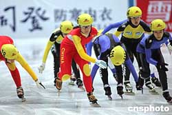 十月三十一日,2004/2005波司登國際滑聯短道速滑世界杯在北京首都體育館落幕,韓國隊發揮出色,包攬當日比賽的全部六枚金牌。圖為復出后的中國首枚冬奧會金牌獲得者楊揚(左二)在女子3000米接力比賽中。作者:武仲林
