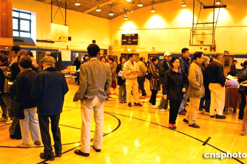 美東時間十一月二日清晨七點多鐘,在紐約市亞裔移民聚居區法拉盛的投票站內,已有五、六十位選民排隊等候投票。作者:龔文謨