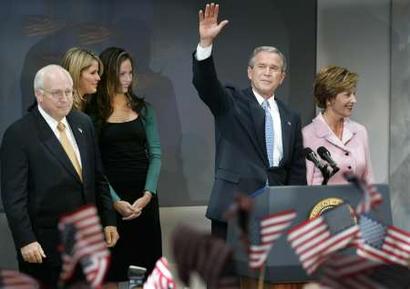 中新網11月4日電 據CNN消息,北京時間11月4日凌晨4時(美國東部11月3日下午15時),獲得總統大選勝利的美國現任總統布什和副總統切尼發表演講。切尼在簡短的發言后便請出了布什。
