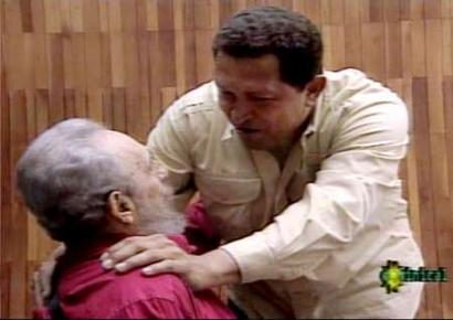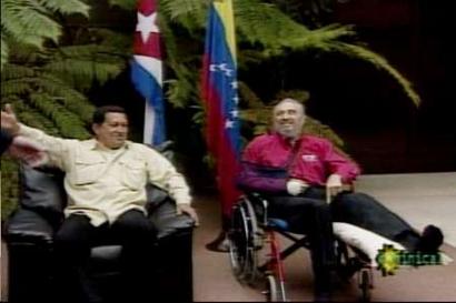 新聞報(bào)道稱,卡斯特羅與查維斯在上星期六晚上舉行了八個(gè)小時(shí)的會談。電視臺的畫面顯示,卡斯特坐在輪椅上,他的腿打了石膏,胳膊也用懸?guī)У踔?/p>