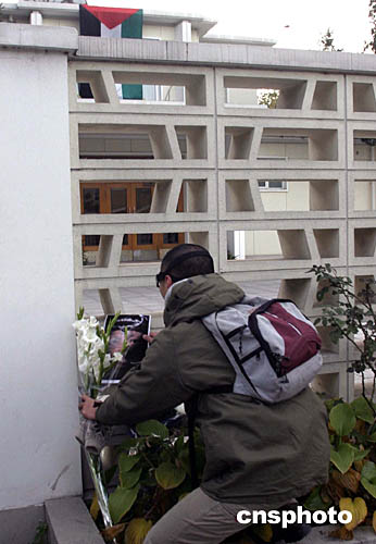 十一月十一日下午,由一些北京市民和學生自發敬獻的一簇簇鮮花擺放在巴勒斯坦國駐華使館門前,表達他們對巴勒斯坦國總統、巴民族權力機構主席阿拉法特的哀悼。阿拉法特當天在法國巴黎病逝。中新社記者:張煒