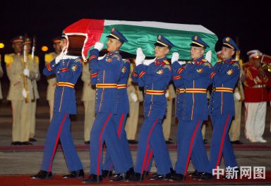中新網(wǎng)11月12日電 法國當(dāng)?shù)貢r間11日下午6點,在巴黎軍用機(jī)場舉行簡單遺體告別儀式后,阿拉法特的遺體已經(jīng)由法國軍方專機(jī)運(yùn)抵埃及首都開羅。