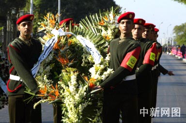 11月12日,在埃及首都開羅,埃及士兵抬著向已故巴勒斯坦民族權力機構主席阿拉法特敬獻的花圈。