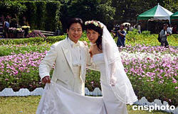 11月12日,臺北市士林官邸舉辦大型菊展,吸引了數以千計的民眾觀賞。圖為一對新人在菊花叢前拍攝婚紗照,場面溫馨浪漫。中新社記者:董會峰
