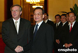 溫家寶說,中歐關系正在深入發展,政治交往十分密切,擴大后的歐盟已成為中國最大的貿易伙伴,雙方在科技、文化等領域的合作也日趨深入。事實表明,中歐合作水平日益提高,鞏固和發展雙邊關系符合中歐的現實和長遠利益。在當前形勢下,中歐應從戰略的高度著眼,不斷充實和發展中歐全面戰略伙伴關系,共同致力于世界的和平、穩定與發展,溫家寶強調,十二月上旬中歐將舉行第七次領導人會晤,中方希望這次會晤在推動中歐關系發展方面取得新的積極進展。