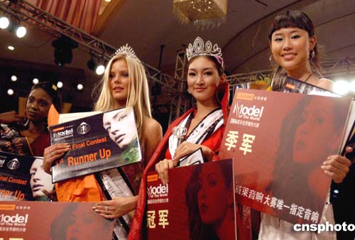 二零零四星際世界模特大賽全球總決賽,十一月十四日晚在廣東珠海舉行,五十位來自全球四十一個國家的專業模特參加角逐。泰國選手(中)獲得冠軍,烏克蘭選手(左)獲得亞軍,中國王琤(右)獲得季軍。作者:劉衛勇
