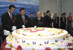 號稱中國開發區“領頭羊”的天津經濟技術開發區迎來二十周歲生日。建區二十年成就展十二月一日在開發區開幕。當年這里還是一片荒涼的鹽堿灘頭,如今已成長為中國環渤海地區最具魅力的經濟區域。圖為開發區歷任行政首腦皮黔生、王述祖、葉迪生等在分切生日蛋糕。作者:柳俊武