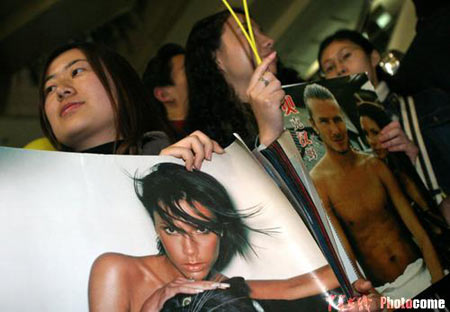 12月1日晚,懷胎7月的維多利亞作為精英模特大賽的評委再次抵達上海,機場有近百名歌迷迎候。圖片來源:中青在線