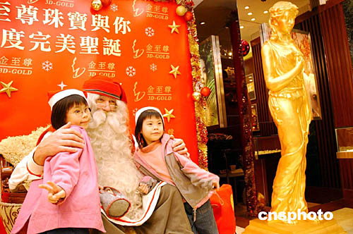 圖為芬蘭圣誕老人在裝飾一新的金至尊珠寶店與市民拍照留念。