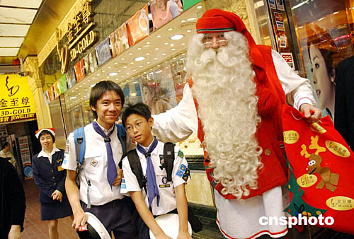 圖為圣誕老人在銅鑼灣鬧市向市民贈送禮物。