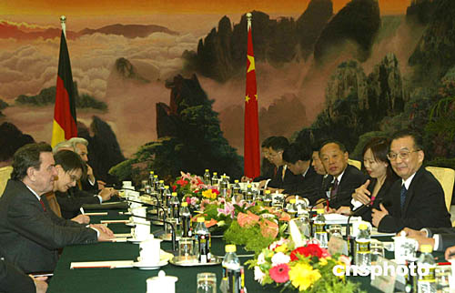 施羅德完全贊同溫家寶對(duì)德中關(guān)系的評(píng)價(jià)和建議。他說,近年來,兩國合作已達(dá)到前所未有的深度和廣度。在《德中聯(lián)合聲明》的指導(dǎo)下,雙邊政治交往密切,經(jīng)貿(mào)關(guān)系充滿活力,法制國家對(duì)話等機(jī)制進(jìn)展良好,文化、教育交流頻繁。