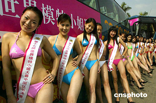 世界模特小姐選手展示風采。正在深圳參加第十七屆世界模特小姐中國賽區總決賽的選手,七日拍攝賽前外景,圖為參賽佳麗身穿泳裝展示風采。中新社記者:錢興強
