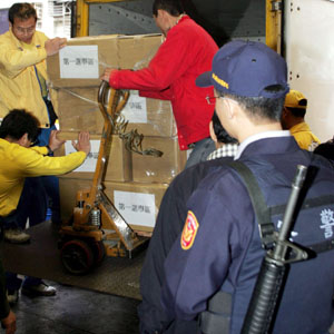 最大票倉的臺北縣270萬張“立委”選票,9日在嚴密警力的戒護下拆封,分別送交29鄉鎮市選務作業中心保管及分裝;將在11日提供選民投票使用。(臺灣媒體圖)