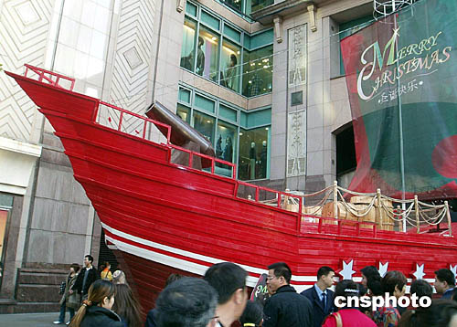 時下,上海圣誕氣氛濃,一艘巨型圣誕船新近亮相淮海路,吸引路人駐足觀賞。作者:潘索菲