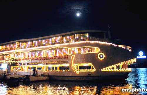 越南近年發展旅游業,在西貢河邊可載三千游客的巨型鯊魚游船燈火通明,游客夜游西貢河別有一番風情。作者:周景洛