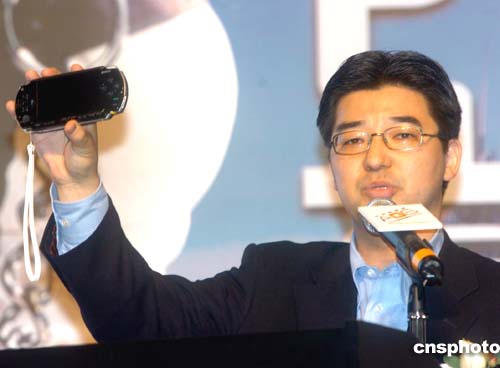 2004年亞洲游戲展17日在香港會(huì)展中心開(kāi)幕﹐日本索尼計(jì)算機(jī)娛樂(lè)PSP業(yè)務(wù)籌備室主任茶谷公之先生在開(kāi)幕式上展示手提游戲機(jī)。作者:趙振清