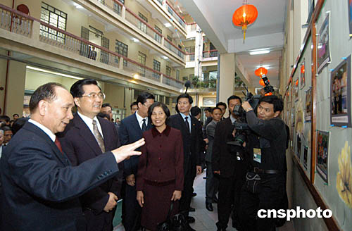 胡錦濤與夫人劉永清在澳門特首何厚鏵的陪同下參觀澳門勞工子弟學校,受到學校師生的熱烈歡迎。