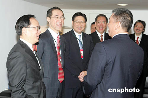 十二月二十日上午,澳門特首何厚鏵與前來出席澳門回歸五周年大會的曾蔭權(quán)等香港政府官員交談。作者:宗金柱