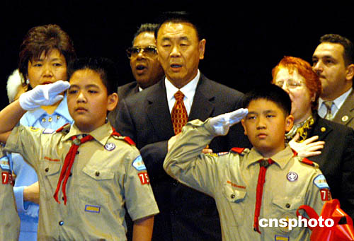 紐約州議長蕭華主持了孟廣瑞的就職儀式,孟廣瑞在夫人和兒女的陪伴下右手放在《圣經》上,舉起左手,宣誓就職成為紐約州歷史上第一位華裔眾議員。