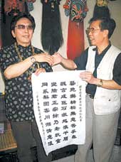 談到變臉風波,曾金貴真誠地對彭登懷說了聲“對不起”。“正像我這副字上面寫的,我只是一個老頑童,彭大師才是真正的變臉大師。我今天就是要向彭登懷表達我的歉意,但是川湘情意濃卻是大家都希望的。”“對,川湘情意濃!”彭登懷連連點頭。