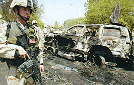 伊拉克當地時間5月17日上午,一列由5輛車組成的車隊駛近巴格達“綠區”駐伊聯軍總部12號檢查站,并依次通過,但就在最后一輛車將要通過的時候,一輛緊挨著車隊停靠的紅色大眾小車發出轟的一聲巨響,最后的那輛轎車連同前后左右的車輛變成了一團火球,伊拉克臨時管理委員會(簡稱臨管會)輪值主席薩利姆就在那輛車上。