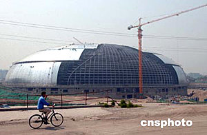 五月二十四日,建筑安裝工人正在國家大劇院殼體穹頂施工。國家大劇院橢圓形殼體穹頂自四月一日開始安裝鈦金屬板以來,工程進展順利,預計六月底完成。中國國家大劇院由法國設計師保羅·安德魯設計。中新社記者:張煒