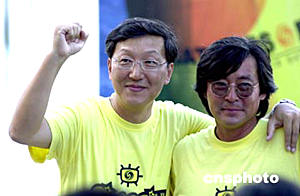 為紀念鄭和下西洋六百周年,一艘命名為“鳳凰號”的單桅帆船將由翁以煊、鄭浩駕駛于七月十三日從當年鄭和寶船開出的南京出發,展開歷時八個月的航海電視行動。圖為五月二十七,“鳳凰號”船員在深圳大鵬灣浪騎游艇俱樂部與媒體記者見面。作者:陳文