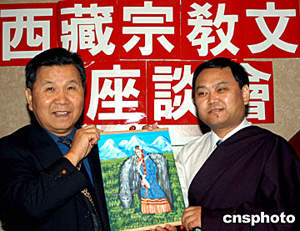 美東時間五月三十一日,正在紐約訪問的中國藏學家、活佛代表團參加紐約亞美文化協會主辦的“西藏宗教文化座談會”。中央民族大學副校長喜饒尼瑪(右)向亞美文化協會會長黃哲操(左)贈送手繪唐卡、史詩《格薩爾》唐卡圖冊等禮物。作者:趙海燕