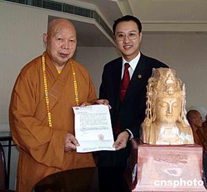 31日,中國佛協會長一誠長老(左)接受香港佛教文化產業總經理吳達镕代表贈送的珍貴觀音頭象,并應聘為香港佛教文化產業永遠榮譽顧問。作者:中新社