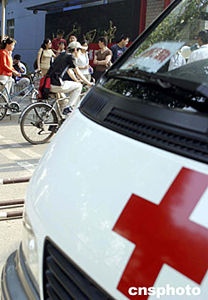 二○○四年六月七日,全國統一高考北京地區各考場外,特別為考生設置了醫療服務急救專用車,以確保高考順利進行。中新社記者:張勤