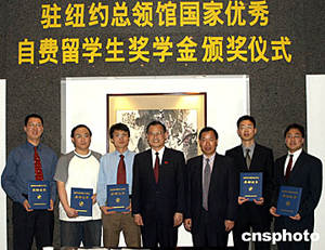 “國家優秀自費留學生獎學金”評選工作去年開始在美國、日本、英國、法國和德國五個國家試點,首屆共有九十五人獲獎,美國三十人,其中紐約總領館領區的美國東北部十個州共有六人獲獎,分別是:哈佛大學政治學專業的閻小駿、麻省理工學院從事媒體實驗室的潘鵬凱、康乃爾大學電子工程專業的吳華強、紐約大學理論化學專業的張大為、新澤西理工學院通信與信號處理專業的何磊、俄亥俄州立大學化學物理專業的劉進軍。