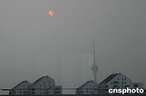六月十四日傍晚,北京遭遇大風(fēng)揚(yáng)塵天氣,夕陽在烏云、沙塵作用下,呈現(xiàn)出少見的天象。中新社記者:武仲林