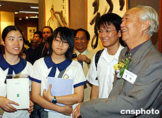 “邵華澤、李琦、馮真書畫展”六月十四日在香港大會堂開幕,是次書畫聯(lián)展共展出作品九十逾幅,圖為李琦在展會上向參觀學生介紹繪畫作品。中新社記者:錢興強