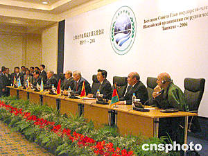 六月十七日,上海合作組織塔什干峰會元首共同會見媒體記者。從右至左是:阿富汗過渡政府總統卡爾扎伊,吉爾吉斯斯坦總統阿卡耶夫,中國國家主席胡錦濤,烏茲別克斯坦總統卡里莫夫,俄羅斯總統普京,哈薩克斯坦總統納扎爾巴耶夫,塔吉克斯坦總統拉赫莫諾夫。中新社記者:李鵬