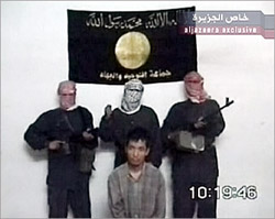 20日晚,阿拉伯“半島”電視臺播放了一段錄影帶,畫面上的武裝份子稱,除非韓國保證在24小時內停止派兵赴伊拉克,否則他們將把一名韓國人質斬首。綁架人質的武裝分子自稱屬于“團結圣戰組織”。該組織曾多次通過電子郵件向半島電視臺發送綁架人質的錄像片段,或在其網站上聲稱對某一襲擊事件負責。據稱,該組織由恐怖頭目扎卡維領導,與“基地”組織有聯系。